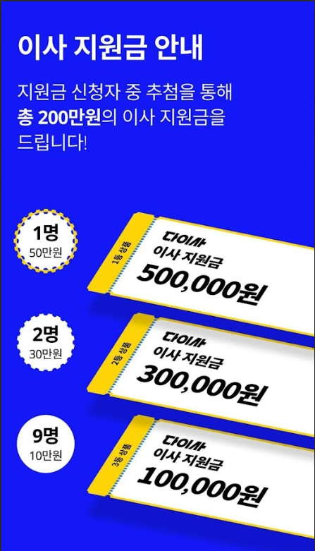 지금 다이사에서는 매월 최대 200만원 상당의 이사지원금 이벤트가 진행 중이에요.