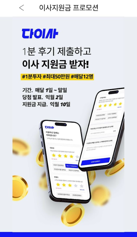 지금 다이사에서는 매월 최대 200만원 상당의 이사지원금 이벤트가 진행 중이에요.